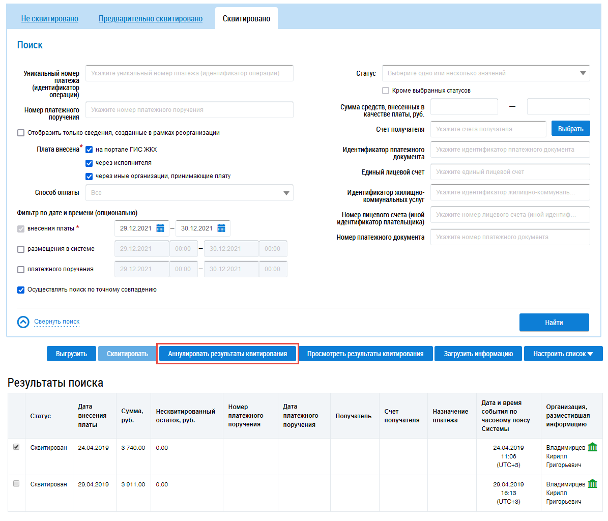 На странице Квитирование при необходимости воспользуйтесь блоком поиска. Введите параметры поиска и нажмите на кнопку Найти (Страница «Квитирование». Кнопка «Аннулировать результаты квитирования»).