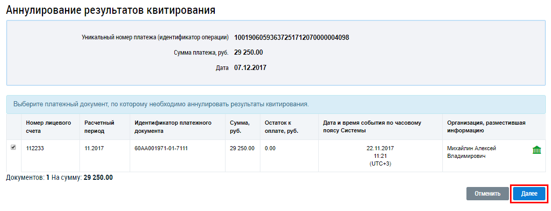 Установите флажок у необходимых извещений и нажмите на кнопку Далее (Страница «Аннулирование результатов квитирования». Кнопка «Далее»).