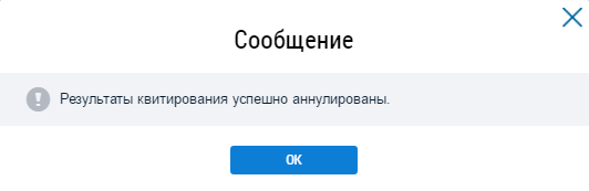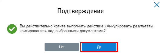 Подтвердите действия по аннулированию результатов квитирования, нажав на кнопку Да (Окно «Подтверждение». Кнопка «Да»). Отображается информационное сообщение о выполнении операции.