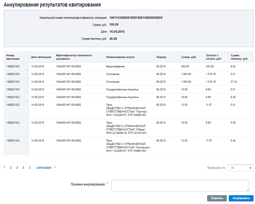 Укажите причину аннулирования результатов квитирования и нажмите на кнопку Аннулировать.