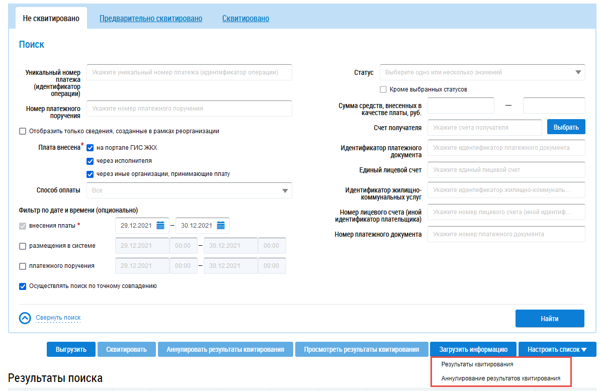 Чтобы загрузить информацию о результатах квитирования, нажмите на кнопку Загрузить информацию.