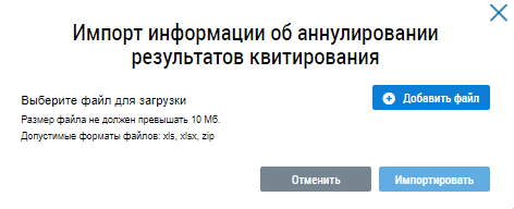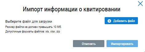 Нажмите на кнопку Добавить файл и выберите с вашего компьютера предварительно заполненный файл импорта информации о результатах квитирования. Дождитесь окончания загрузки файла и нажмите на кнопку на кнопку Импортировать.