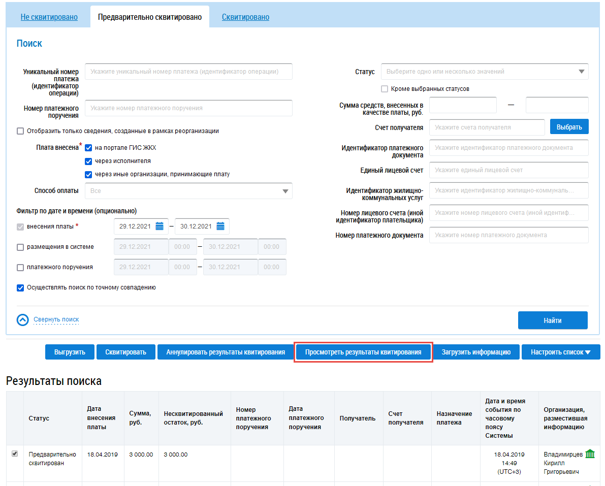 Операция просмотра результатов квитирования доступна для извещений в статусах Сквитирован, Частично сквитирован, Предварительно сквитирован, Отсутствует возможность сквитировать.