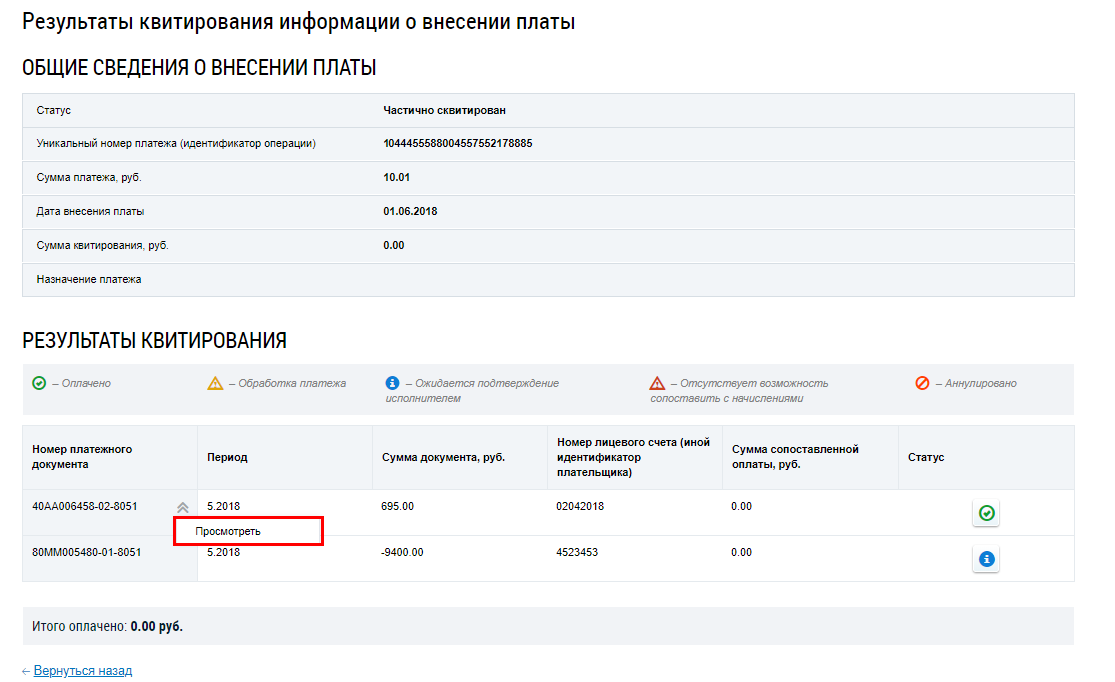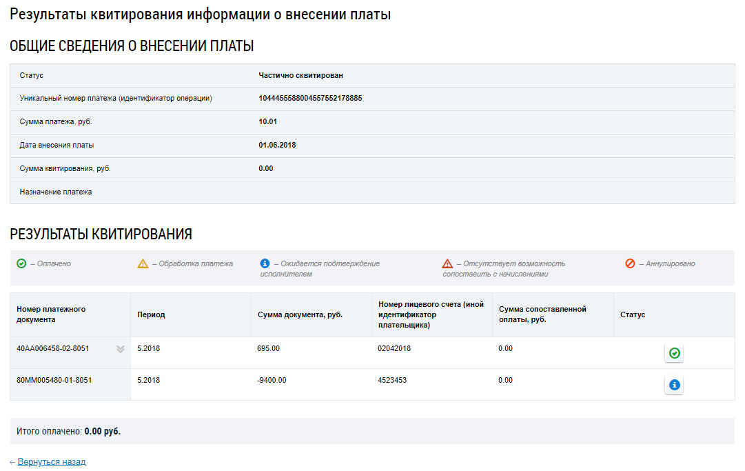 Для возврата на страницу квитирования нажмите на кнопку Вернуться назад на странице Результаты квитирования информации о внесении платы.