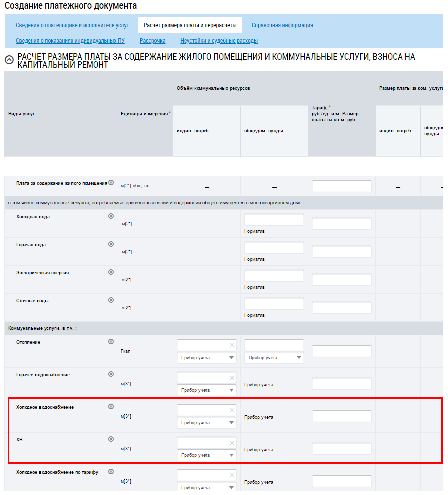 Заполните обязательные поля и перейдите на вкладку Расчет размера платы и перерасчеты.