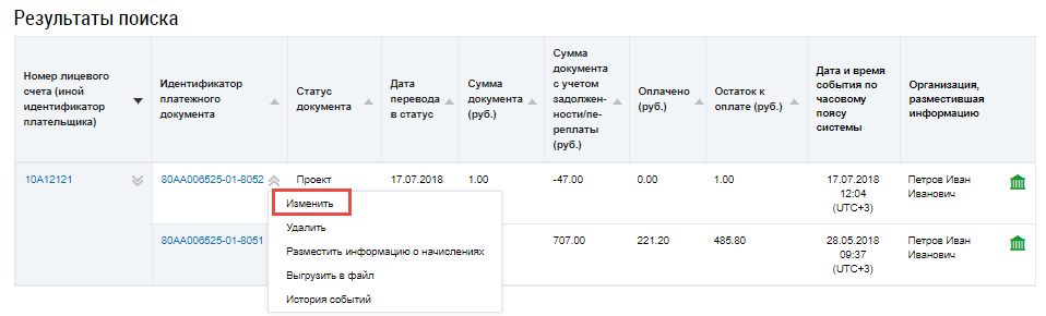 Для редактирования платежного документа выберите пункт контекстного меню Изменить для платежного документа со статусом, отличным от Размещен.