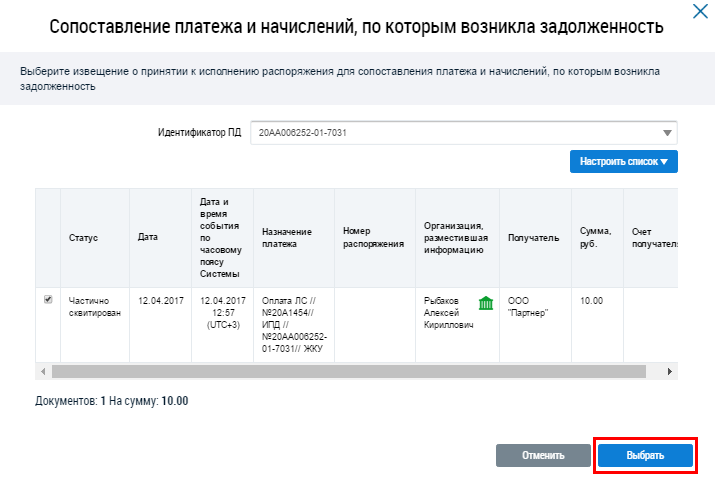 В отобразившемся окне Сопоставление платежа и начислений, по которым возникла задолженность выберите из выпадающего списка Идентификатор ПД, затем установите переключатель у выбранного извещения о принятии к исполнению распоряжения и нажмите на кнопку Выбрать.