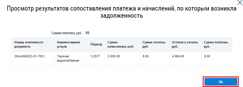 Для закрытия окна просмотра результатов сопоставления платежа и начислений, по которым возникла задолженность нажмите на кнопку Ок.