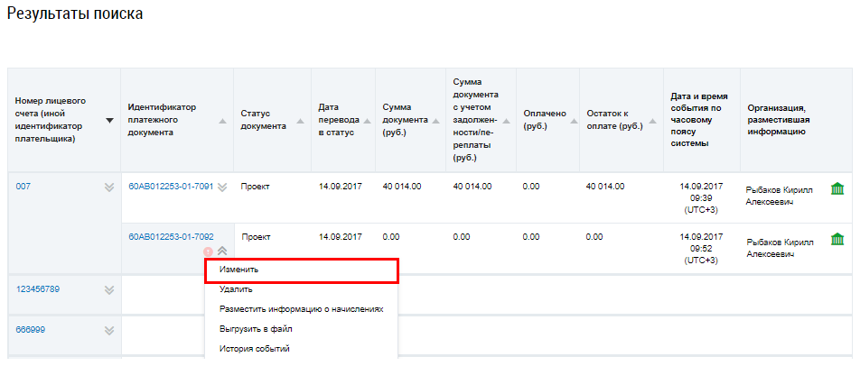 Для редактирования долгового платежного документа выберите пункт контекстного меню Изменить для платежного документа со статусом отличным от Размещен.