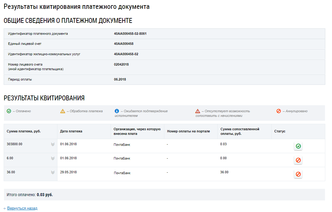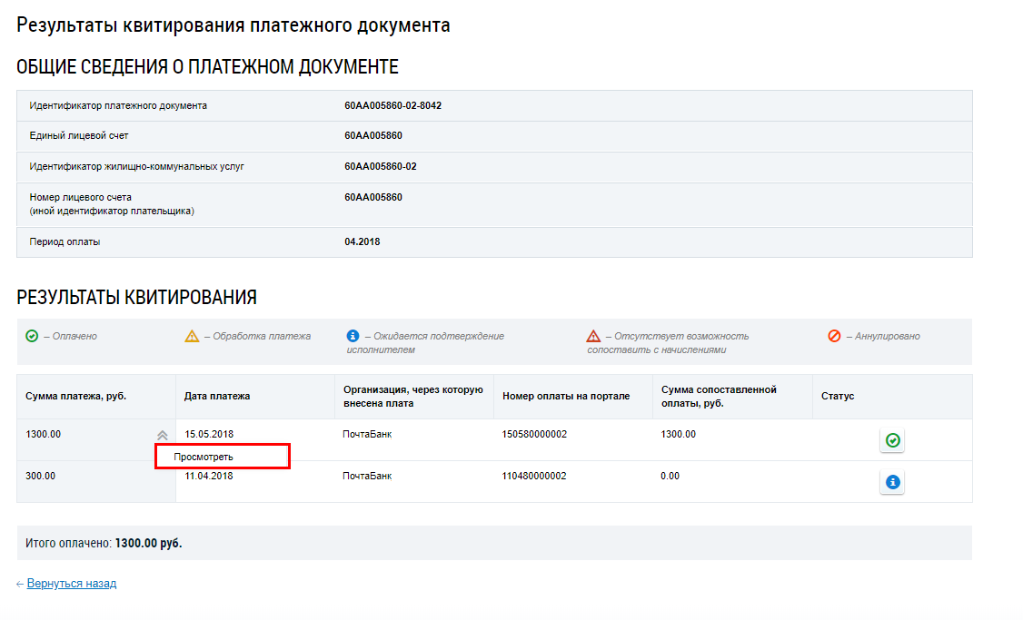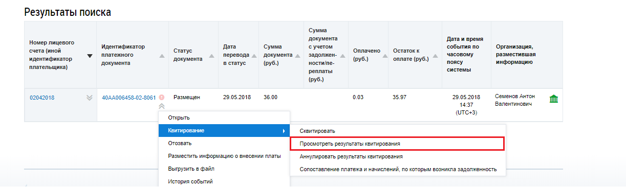 Просмотр результатов квитирования платежного документа