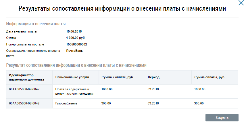 Отображается окно Результаты сопоставления информации о внесении платы с начислениями. Для возврата на страницу результатов квитирования нажмите на кнопку Закрыть.
