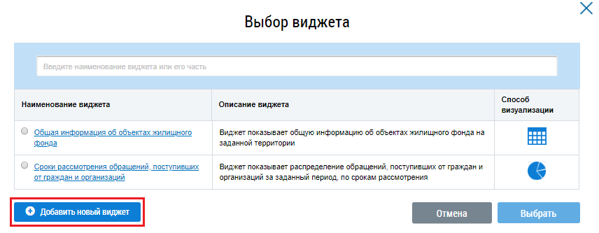 Отображается окно Добавление нового виджета.