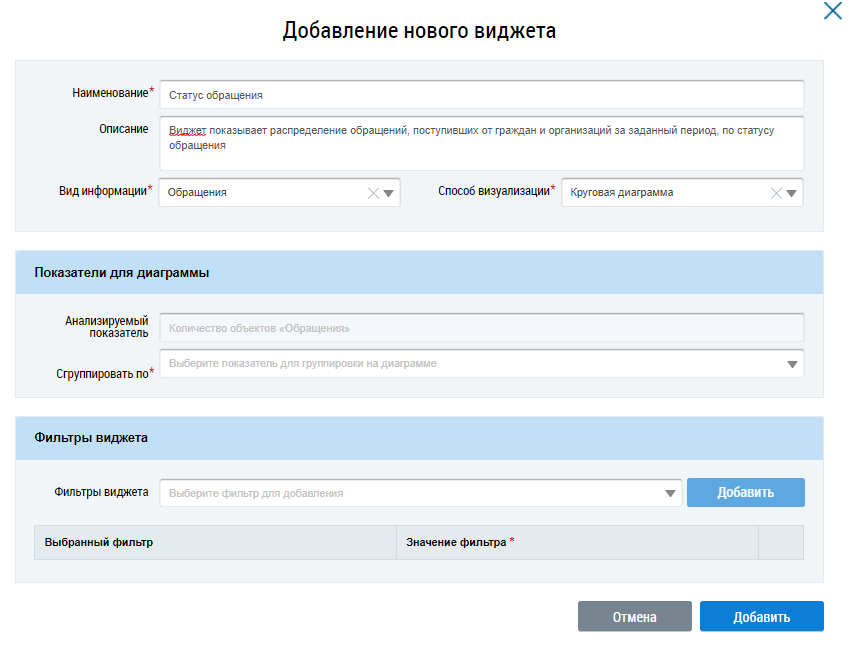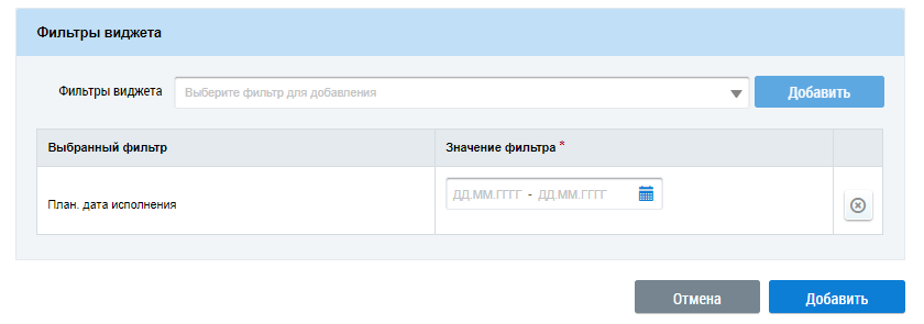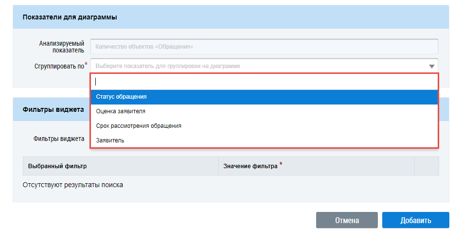 Для добавления фильтра виджета выберите значения из выпадающего списка и нажмите на кнопку Добавить. Выбранные фильтры отображаются в блоке Фильтры виджета.