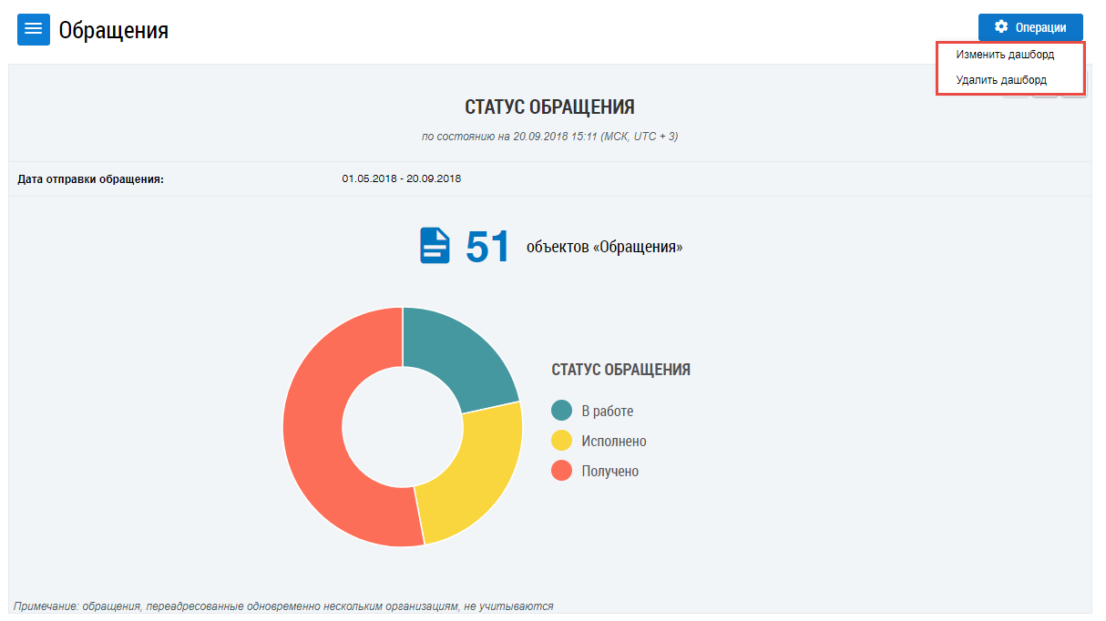 Для изменения дашборда нажмите на кнопку Операции и выберите пункт Изменить дашборд.