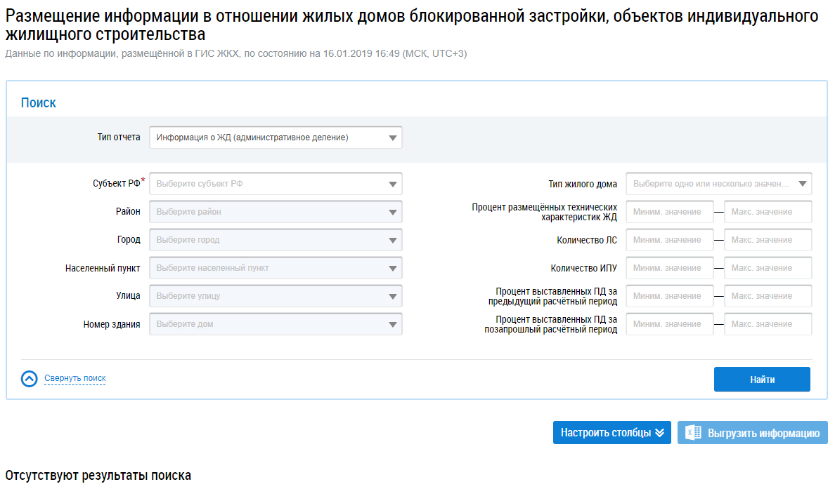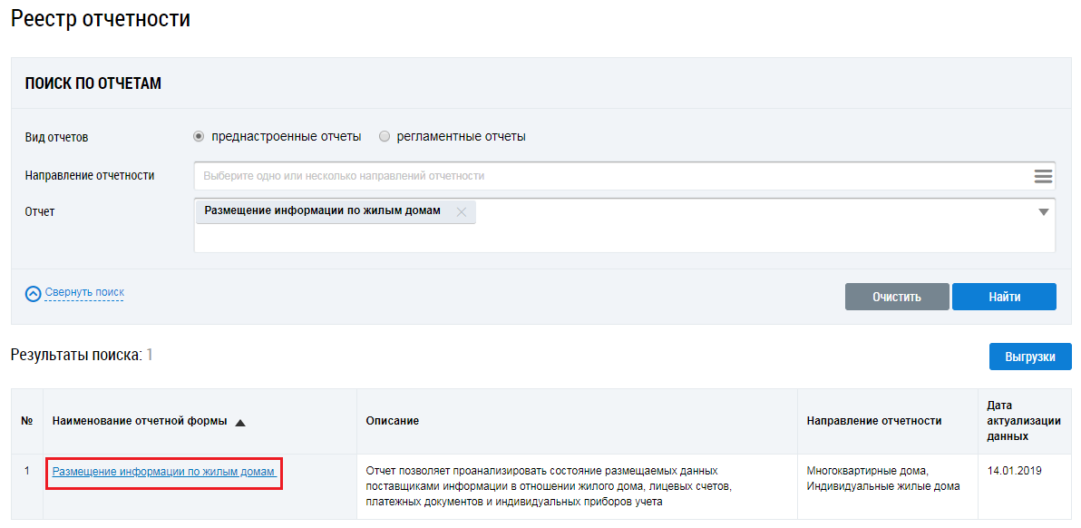 Для перехода на страницу Размещение информации в отношении жилых домов блокированной застройки, объектов индивидуального жилищного строительства установите переключатель Преднастроенные отчеты. Выберите необходимый вид отчета из выпадающего списка и нажмите на кнопку Найти. Затем нажмите на гиперссылку с наименованием отчета Размещение информации по жилым домам.