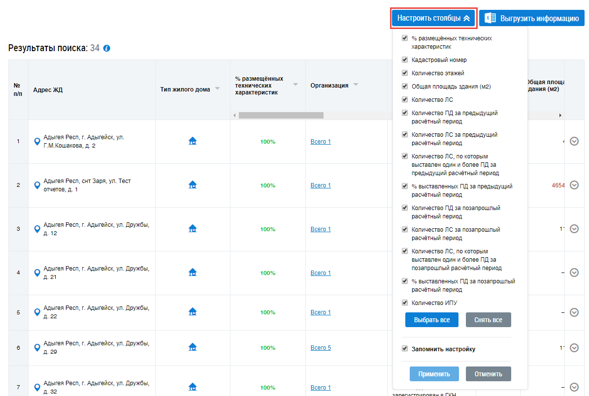 Для настройки параметров отображения информации на странице нажмите на кнопку Настроить столбцы.