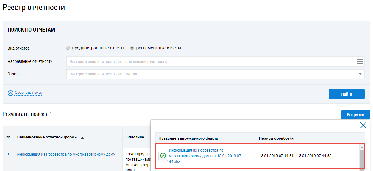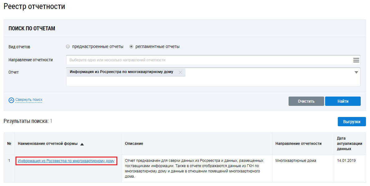 Для работы с регламентными отчетами установите переключатель Регламентные отчеты. Затем нажмите на гиперссылку с наименованием отчета Информация из Росреестра по многоквартирному дому.