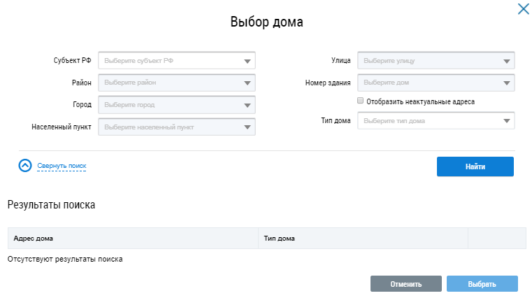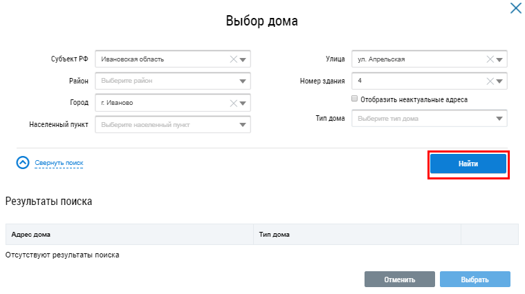 В отобразившемся окне Выбор дома последовательно заполните поля, начиная с поля Субъект РФ и выбирая значения из выпадающих списков. При необходимости установите флажок Отобразить неактуальные адреса. После заполнения параметров поиска нажмите на кнопку Найти.