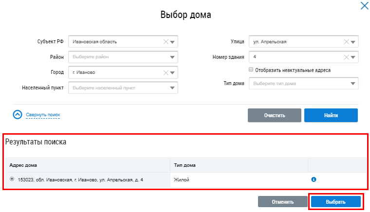 Установите переключатель напротив адреса дома и нажмите на кнопку Выбрать.