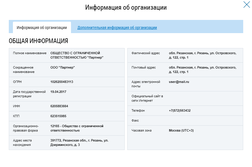 Нажмите на гиперссылку с наименованием организации. Отображается окно Информация об организации.