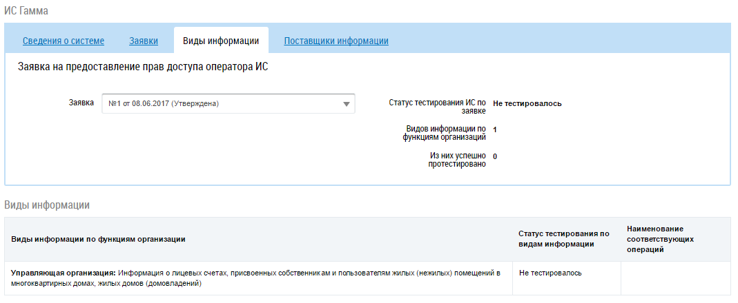 Вкладка Виды информации содержит сведения о тестировании ИС и результатах тестирования, если была подана заявка на тестирование. Для просмотра результатов тестирования определенной заявки выберите в выпадающем списке поля Заявка необходимое значение.