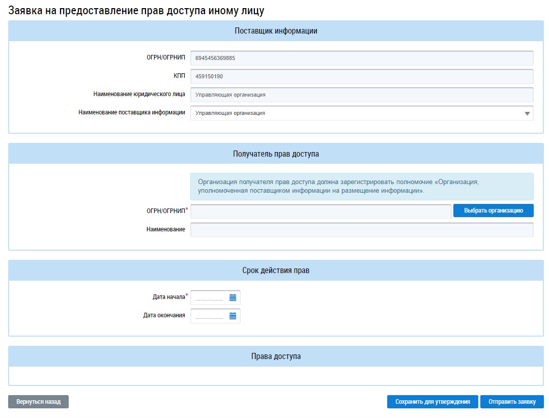 - руководителю организации - с возможностью сохранения заявки и отправки заявки получателю прав;