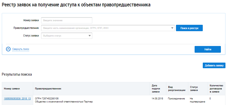 Основанием для получения доступа к информации, размещенной в Системе организацией-правопредшественником, служит заявка, подтвержденная данными ЕГРЮЛ1.