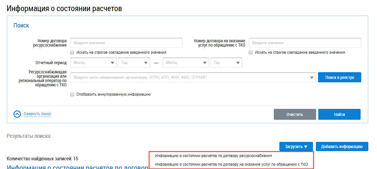 Для загрузки информации о состоянии расчетов в Систему нажмите на кнопку Загрузить и выберите необходимый вид договора.