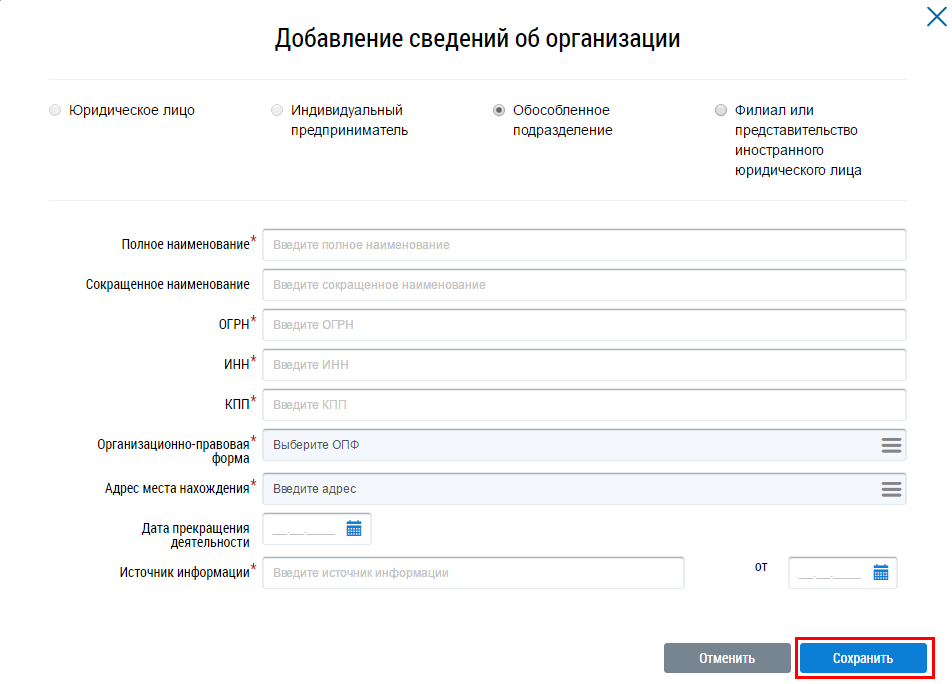 В отобразившемся окне Добавление сведений об организации заполните обязательные поля и нажмите на кнопку Сохранить.