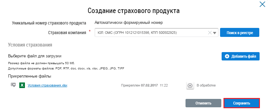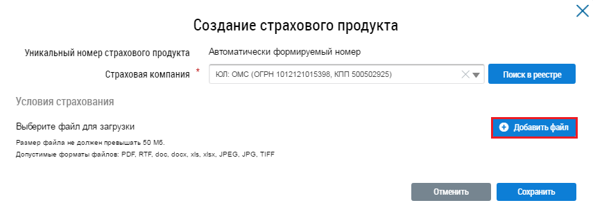 Прикрепите условия страхования, нажав на кнопку Добавить файл.
