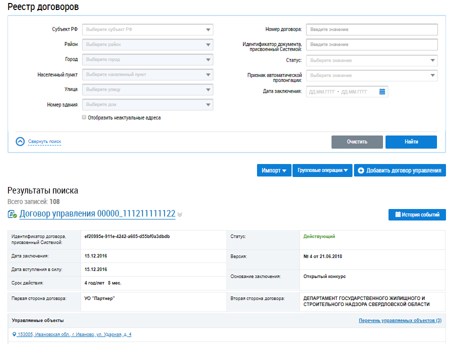 Страница содержит блок поиска, блок результаты поиска, кнопки Добавить договор управления, Импорт.