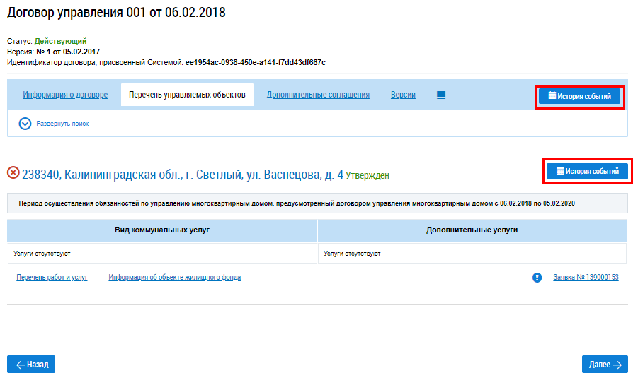 В договорах управления не предусмотрены специальные отметки для домов-дублей. Для идентификации дома, добавленного в договор управления или устав последним (дом с основным адресом), рекомендуется воспользоваться историей событий управляемого объекта, переход в который осуществляется из карточки договора/устава.