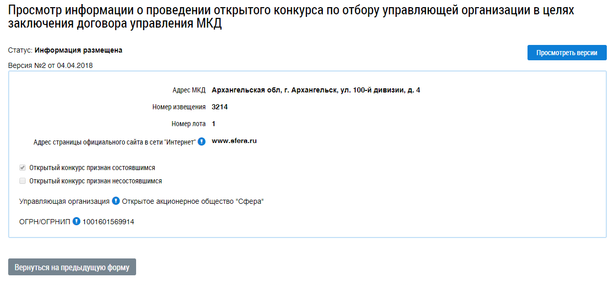 Отображается страница Просмотр информации о проведении открытого конкурса по отбору управляющей организации в целях заключения договора управления МКД.