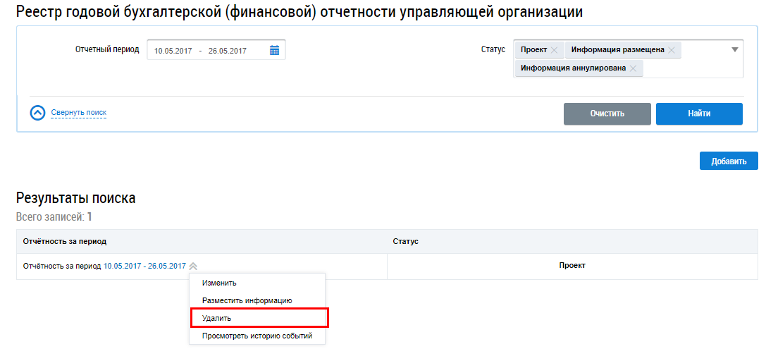 Для удаления информации об отчетности управляющей организации выберите пункт контекстного меню Удалить.