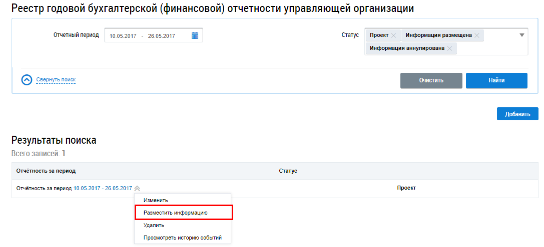 Для размещения информации об отчетности управляющей организации выберите пункт контекстного меню Разместить информацию.