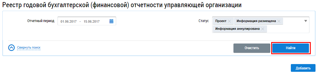 Поиск годовой бухгалтерской (финансовой) отчетности управляющей организации