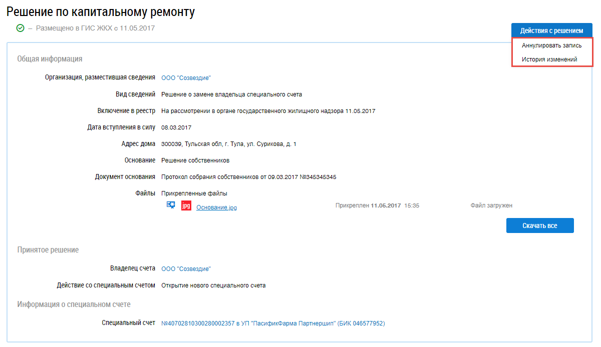 Решение переходит в статус Аннулировано. При аннулировании информации о решении, также аннулируется версия реквизитов счета, созданная на основании решения, и все последующие версии реквизитов счета, которые ссылаются на это решение. Для просмотра информации об аннулированном специальном счете перейдите в п. Реестр счетов.