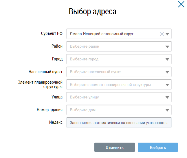 заполнения поля Субъект РФ выберите значение из выпадающего списка. Для