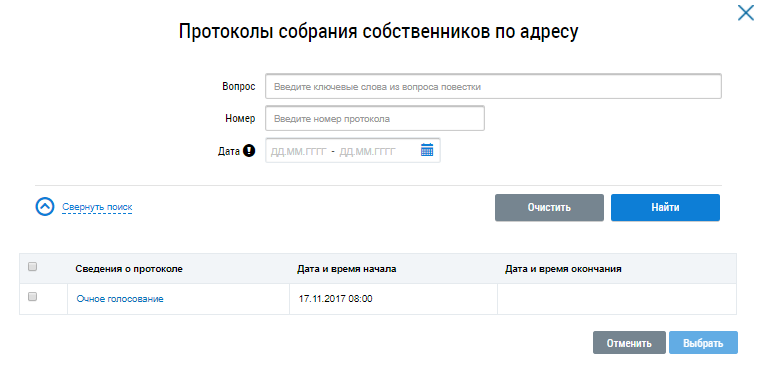 Для заполнения поля Документ основания нажмите на кнопку Выбрать. Отображается окно Протоколы собрания собственников по адресу.