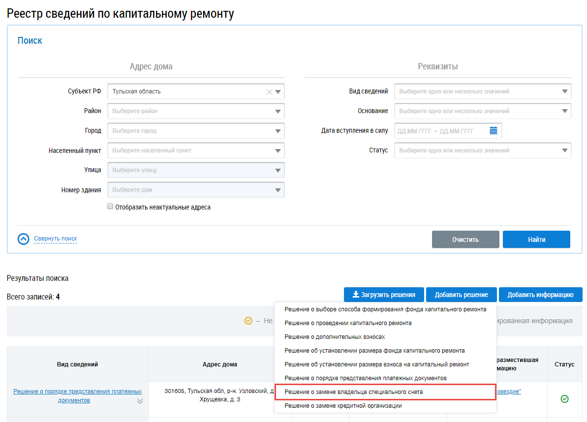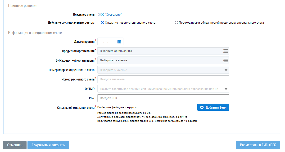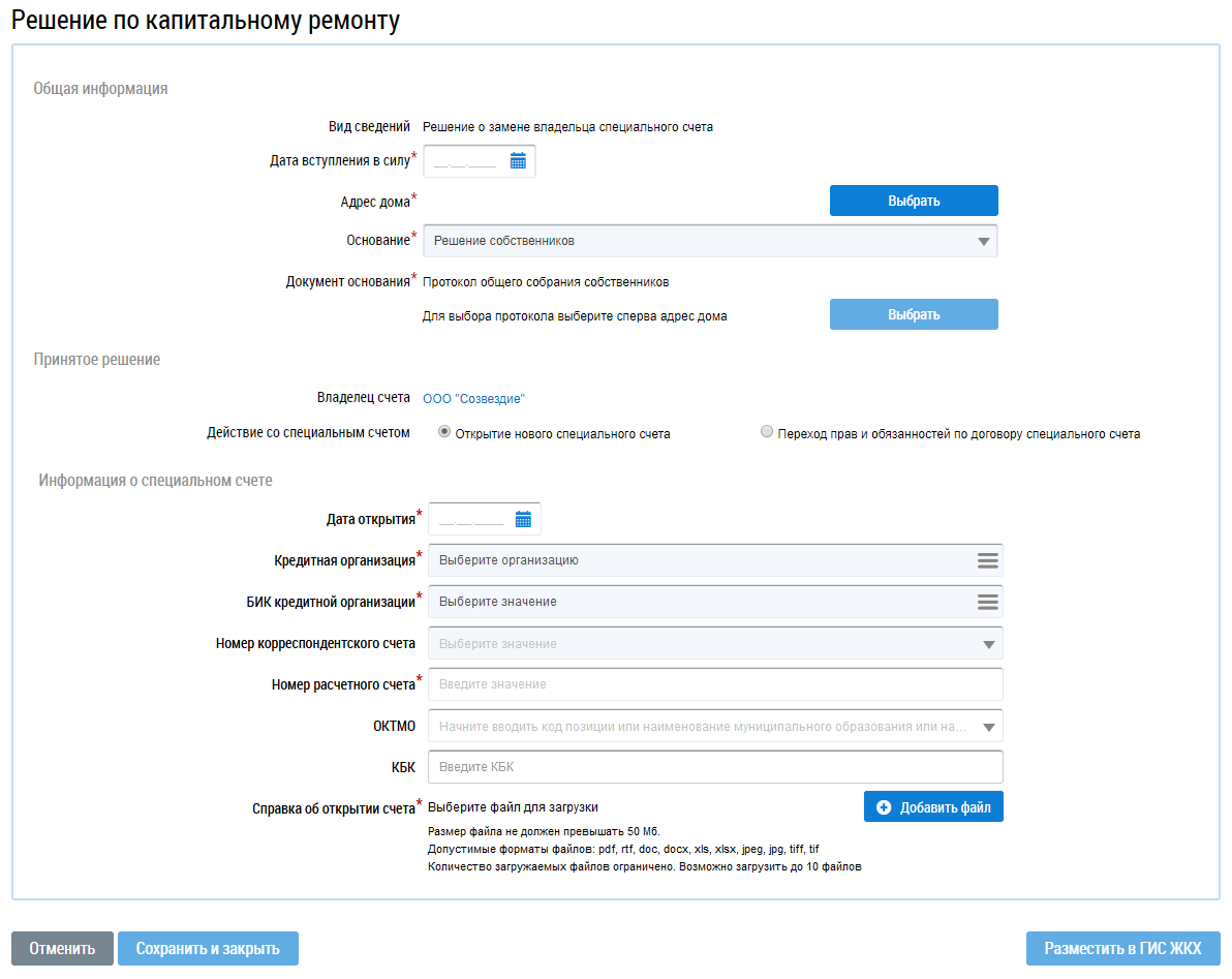 Если решение о способе формирования фонда капитального ремонта ранее не размещалось другим поставщиком – владельцем специального счета, то при размещении решения о замене владельца специального счета в случае перехода прав и обязанностей по договору специального счета существует возможность разместить данные о специальном счете.
