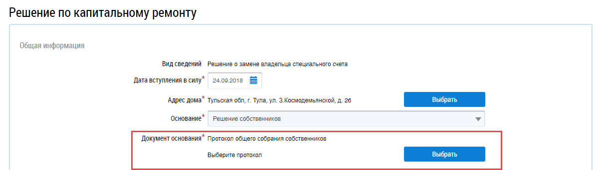 Выбранная организация отображается на странице добавления решения по капитальному ремонту.