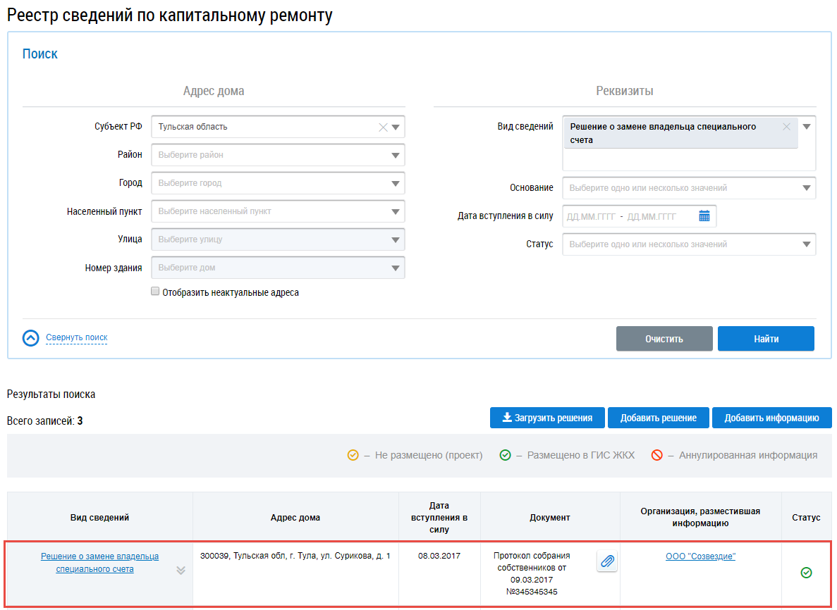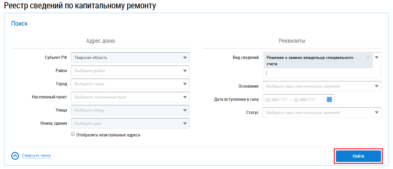 Для поиска по реестру сведений по капитальному ремонту введите параметры поиска.
