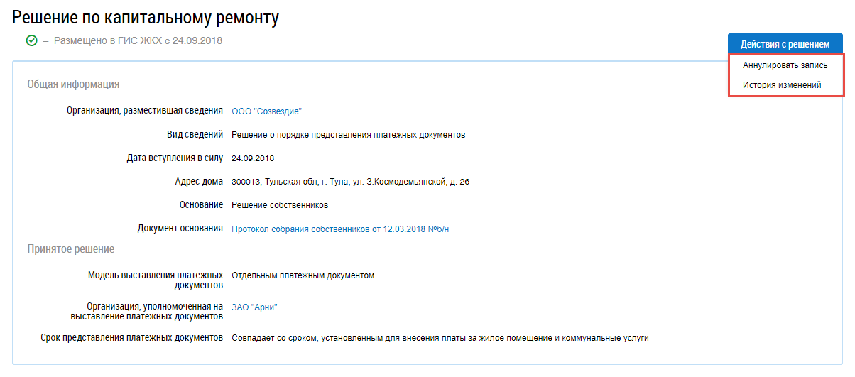 Чтобы аннулировать решение, раскройте контекстное меню решения в статусе Размещено в ГИС ЖКХ и выберите пункт Аннулировать запись (см. Контекстное меню. Статус – «Размещено в ГИС ЖКХ») или на странице просмотра решения по капитальному ремонту нажмите на кнопку Действия с решением и выберите в выпадающем меню пункт Аннулировать запись (Фрагмент страницы «Решение по капитальному ремонту». Кнопка «Действия с решением»).