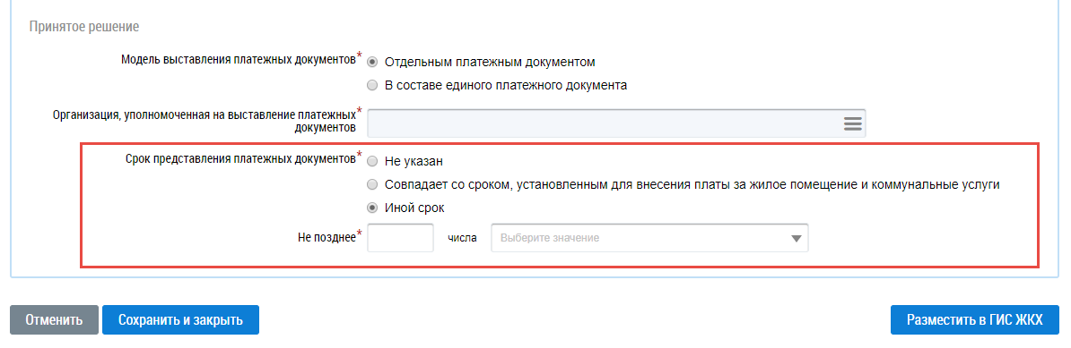 Для заполнения поля Срок представления платежных документов установите переключатель напротив необходимого значения. При выборе значения Иной срок отображается дополнительное для заполнения поле.