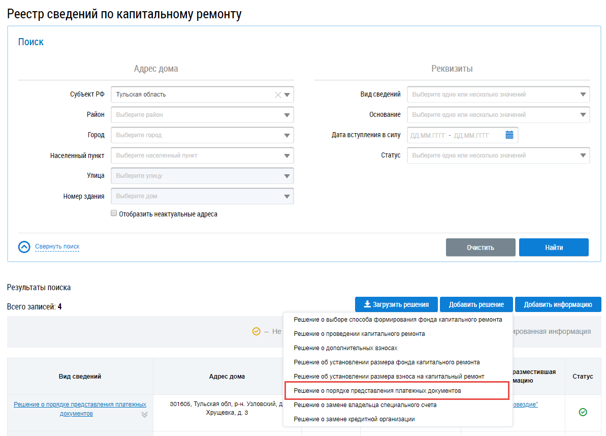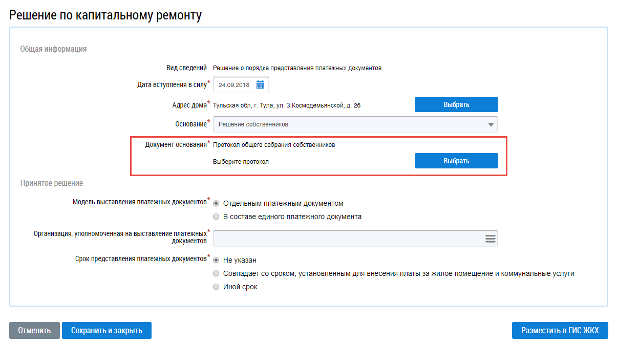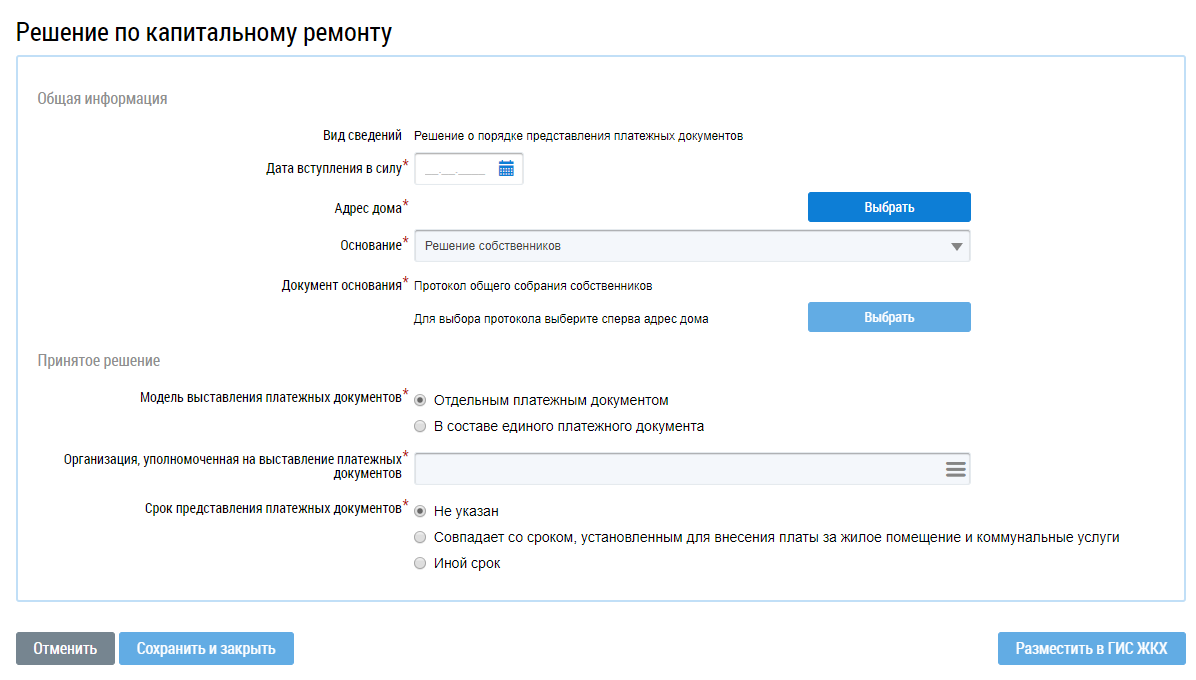 Решение о порядке предоставления платежных документов размещается в ГИС ЖКХ, если оно было принято на основании протокола общего собрания собственников. Если же общее собрание не проводилось, то необходимо размещать информацию о порядке предоставления платежных документов, основанием для размещения которой являются действия владельца специального счета (п. Добавление информации о порядке представления платежных документов).