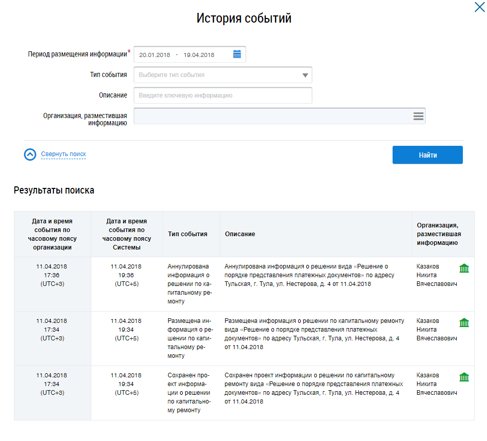 Отображается окно История событий.