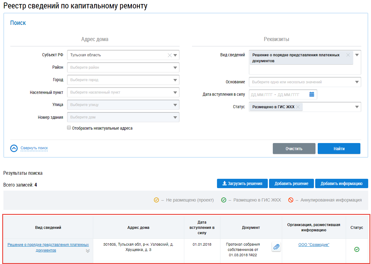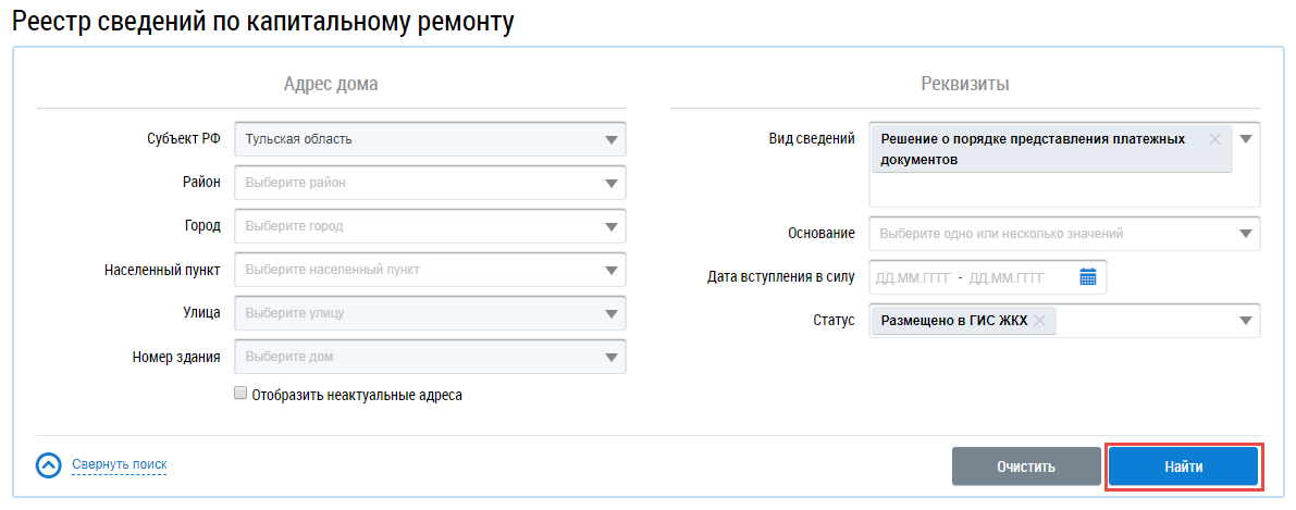 Для поиска по реестру сведений по капитальному ремонту введите параметры поиска.