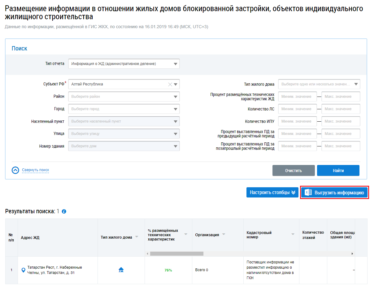 Чтобы выгрузить информацию по ЖД, нажмите на кнопку Выгрузить информацию на странице Размещение информации в отношении жилых домов блокированной застройки, объектов индивидуального жилищного строительства.