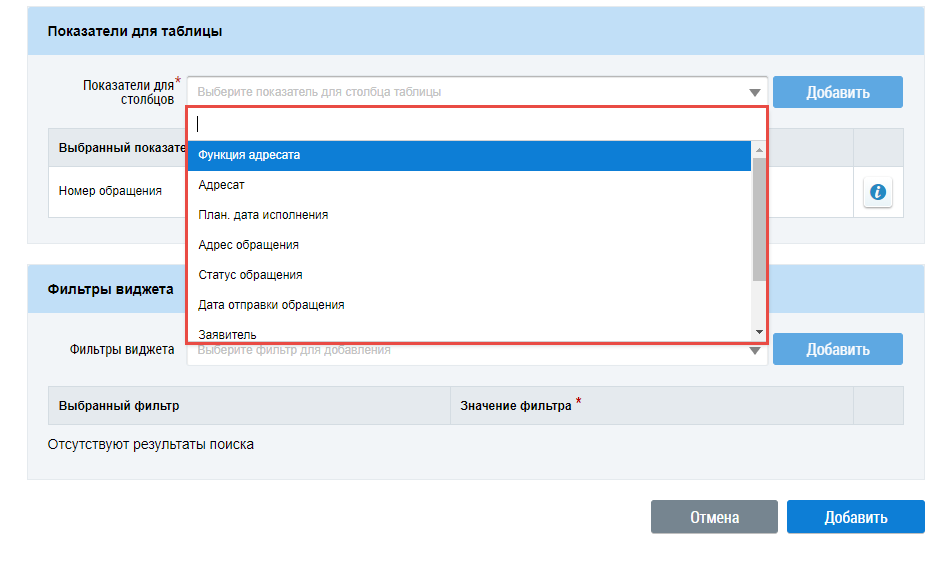 Для выбора показателей для столбцов выберите значения из выпадающего списка и нажмите на кнопку Добавить.