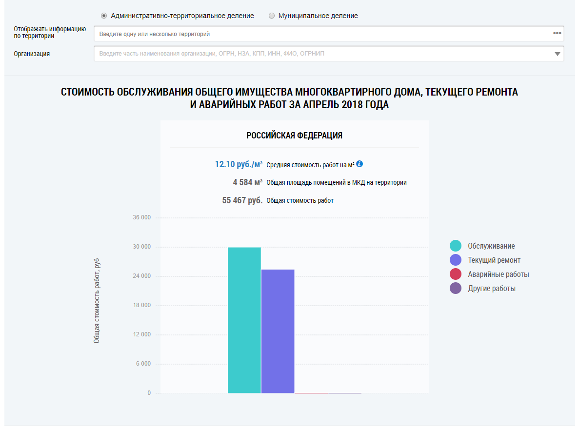 Под картой расположена гистограмма с информацией о стоимости обслуживания общего имущества многоквартирного дома, текущего ремонта, аварийных и других работ (работ по обращениям граждан, работ по ограничениям поставки, подготовка ОКИ к отопительному сезону, иных работ). По умолчанию на гистограмме отображается информация по РФ в целом.